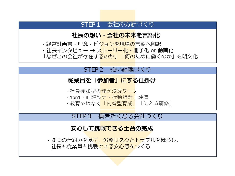| 会議では意見が出ず、社長だけが話して終わる | 若手や現場からも意見・アイデアが出てくる「参加する会議」に変わる |